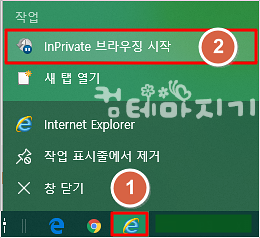 최근의 인터넷 사용자 동향을 보면, 크롬이나, 엣지 인터넷 부라우저를 사용하는 비율이 갈수록 커가고 있지만, 아직도, 인터넷 익스플로러 환경을 유지하는 경우도 많이 있습니다. 인터넷 익스플로러를 사용할 때, 만약에 보안상 사용기록을 남기지 않고자 한다면, 아래 화면과 같이 1. 인터넷 익스플로러 아이콘위에 마우스 커서를 위치하고 마우스 오른쪽키를 클릭하여 메뉴중 2. InPrivate 브라우징 시작을 사용하면 됩니다.