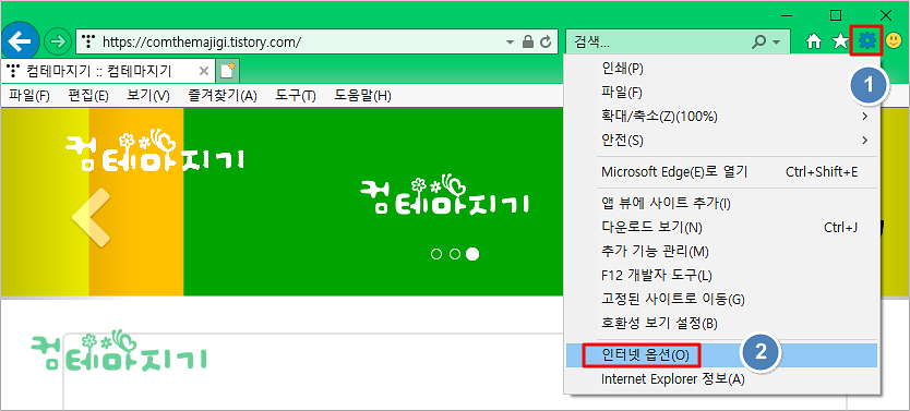 먼저, 오른쪽 상단 1. 톱니바퀴 모양의 설정 아이콘을 클릭하여, 나타난 메뉴 중에서 2. 인터넷 옵션(O)을 클릭합니다.