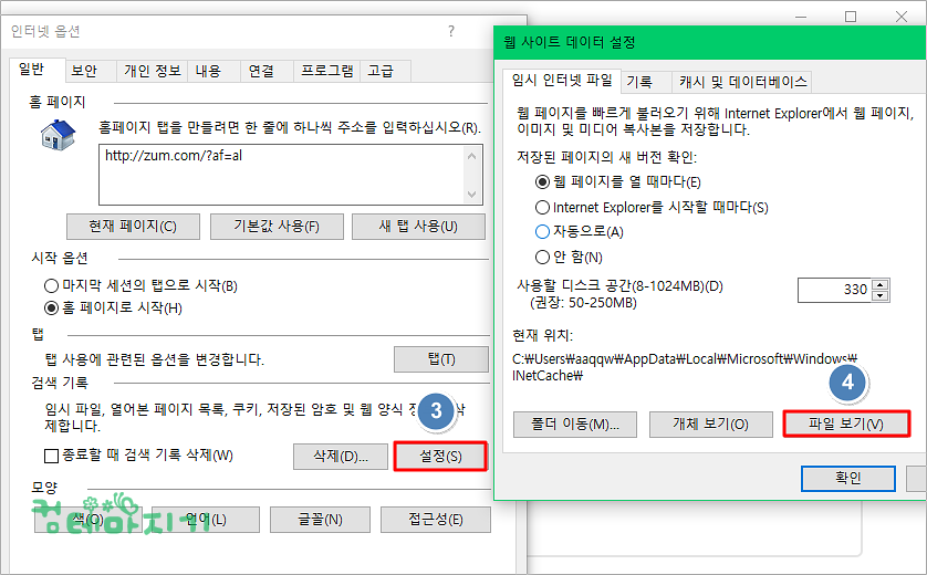 ▼ 인터넷 옵션화면 검색기록을 확인하기 위해서, 일반탭에서 검색기록 항목의 3. 설정을 클릭합니다. 오른쪽 웹 사이트 데이터 설정화면에서 4. 파일보기를 클릭합니다.