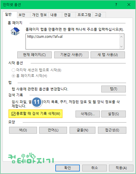 ▼ 마지막으로 한가지 더 작업해 줄 내용은 역시 일반탭에서 11. 종료할 때 검색 기록 삭제를 체크해 줍니다. 이 시간에는 인터넷 사용 기록 삭제하는 방법에 대해서 알아 보았습니다.