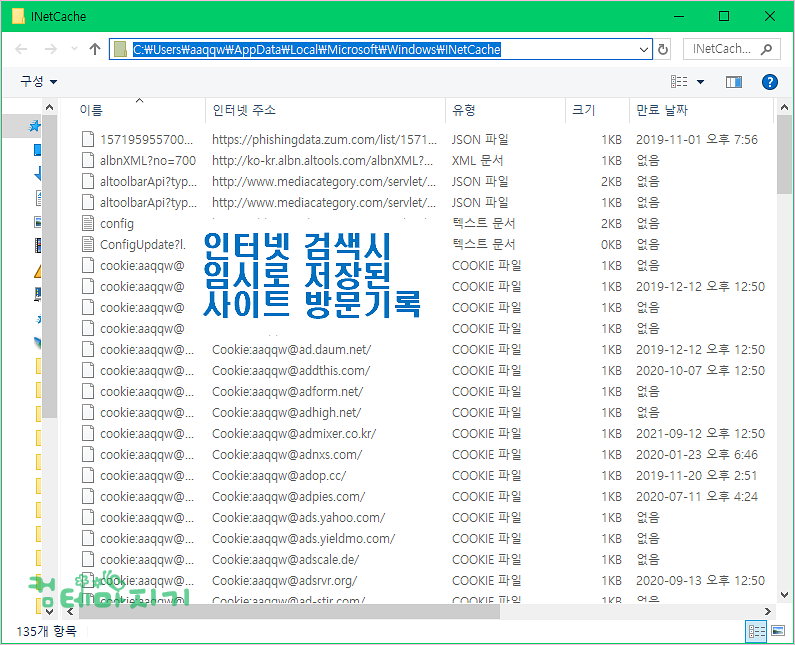▼ 윈도우 아이넷캐쉬(INetCache) 폴더안에 방문사이트, 검색기록등 인터넷 익스플로러를 이용한 정보가 저장되어 있습니다.