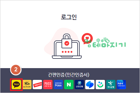 ▼ 로그인화면에서 간편인증(민간인증서)에서 2. 카톡을 선택합니다.(나에게 맞는 간편인증 선택)
