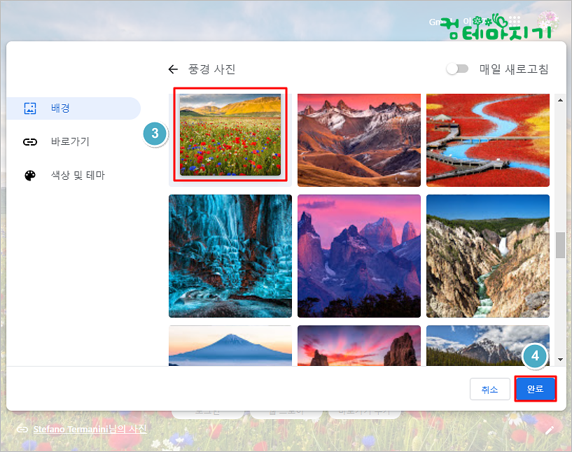 ▼ 풍경 사진 화면에서 다양한 풍경사진이 제공되는데요, 좋아하는 3. 풍경사진을 선택한 다음, 4. 완료를 클릭합니다.