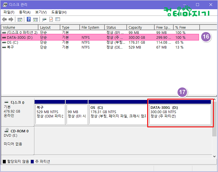 ▼ 다시 디스크 관리화면에서 보면 17. DATA-300G (D:)의 D드라이브가 생성된 것을 확인 할 수 있습니다. 이 시간에는 SSD 파티션 분할 방법에 대해서 알아보았습니다.