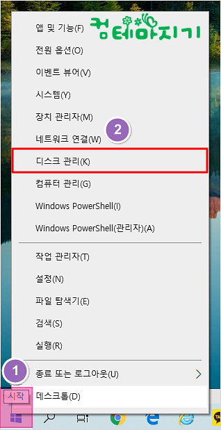 바탕화면 좌측 하단의 1. 시작아이콘을 마우스우클릭, 메뉴중에서 2. 디스크 관리(K)를 선택합니다.