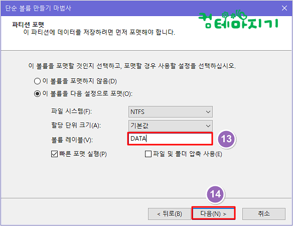 ▼ 파티션 포멧화면에서 포멧을 진행하기에 앞서 볼륨 레이블을 정합니다. 여기서는 13. DATA-300G로 이름을 주고 14. 다음을 클릭합니다.