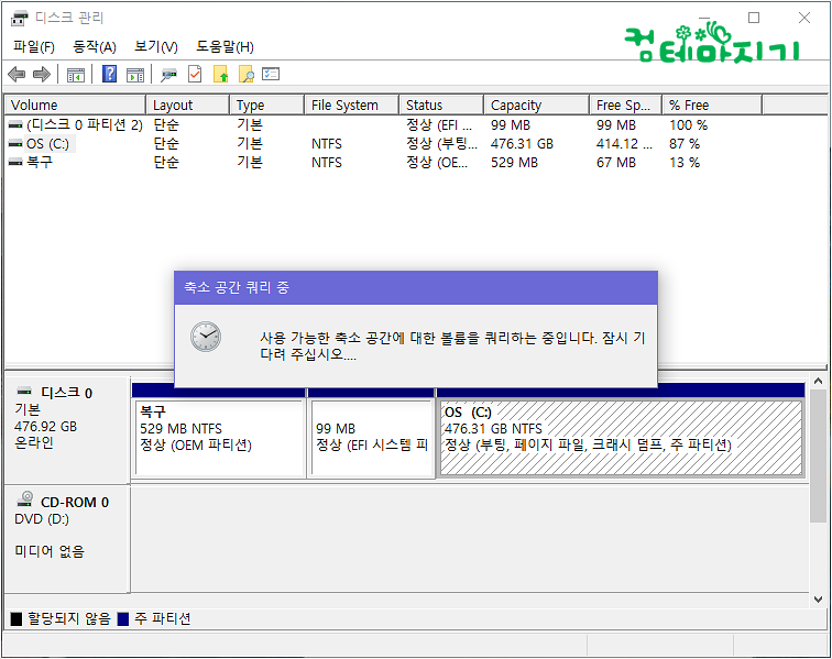 ▼ SSD의 분할되지 않은 용량이 3. (476G)로 나타납니다. 현재 파티션 상태를 4. OS (C:) 471.31 GB NTFS로 보여 주고 있습니다. C: 드라이브를 C:와 D: 드라이브로 분할하도록 하겠습니다.