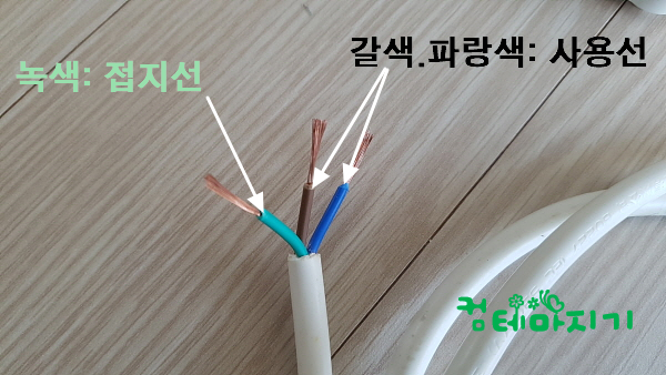 실제사용되는 두선은 갈색과 파랑색전선이고, 접지선은 녹색입니다.