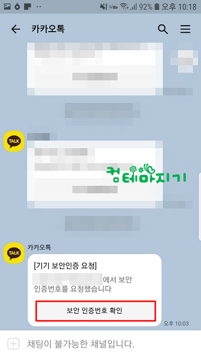 [스마트폰의 카카오톡 알림에서 보안 인증번호 확인]