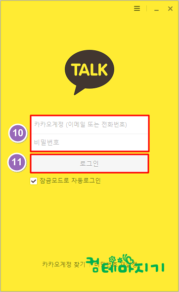 ▼ 아래 화면과 같이 PC버전을 사용하기 위해서 10. 카카오 계정과 비밀번호를 입력한 다음, 11. 로그인합니다.