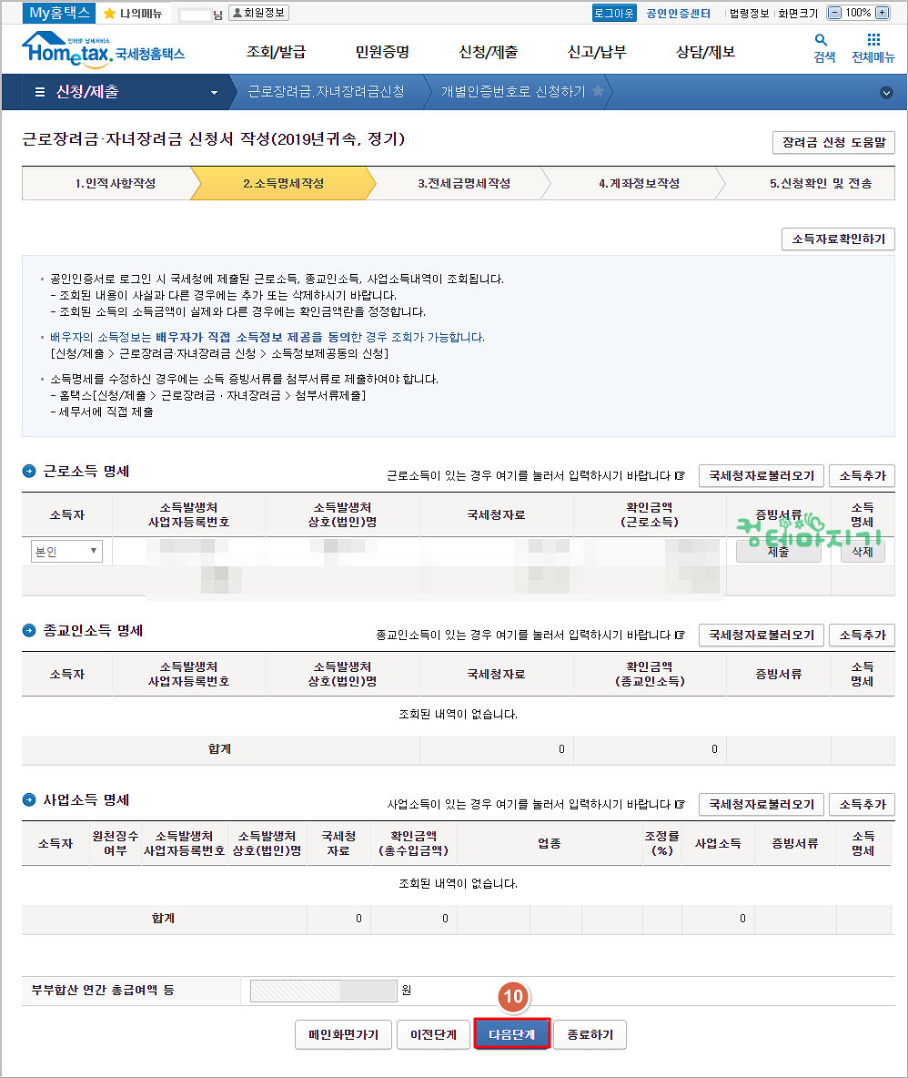 ▼ 소득 명세는 국세청에 등록된 자료를 바탕으로 출력이 됩니다. 확인한 다음, 10. 다음 단계를 클릭합니다.