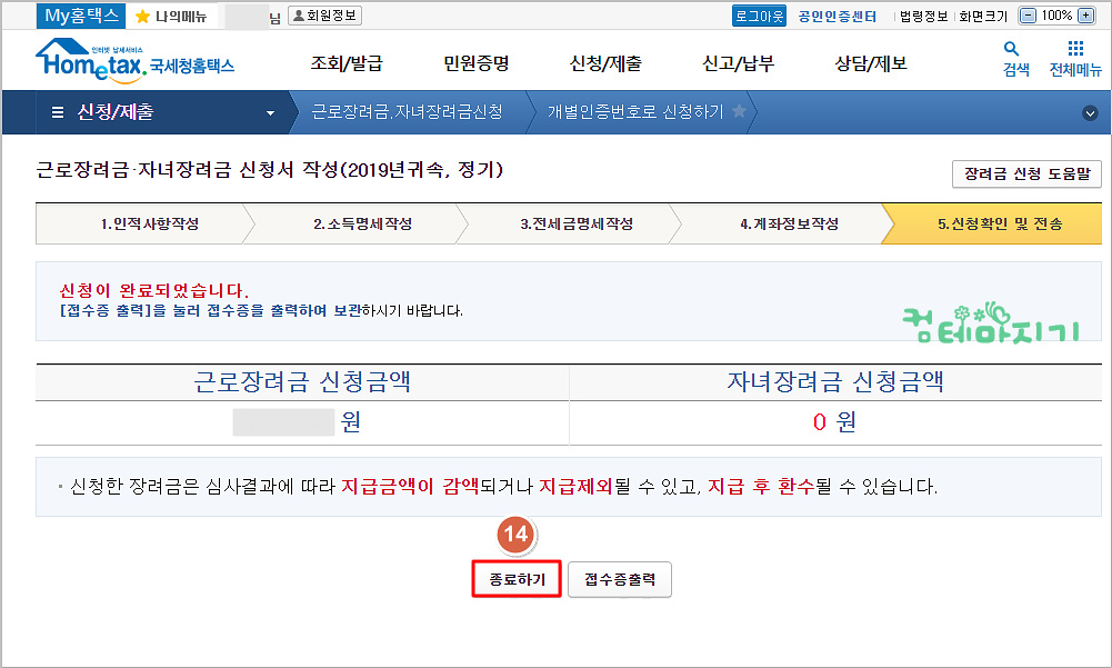 ▼ 근로장려금.자녀장려금 신청금액이 화면에 나타납니다. 금액을 확인한 다음, 14. 종료하기를 클릭하면 마무리 됩니다.