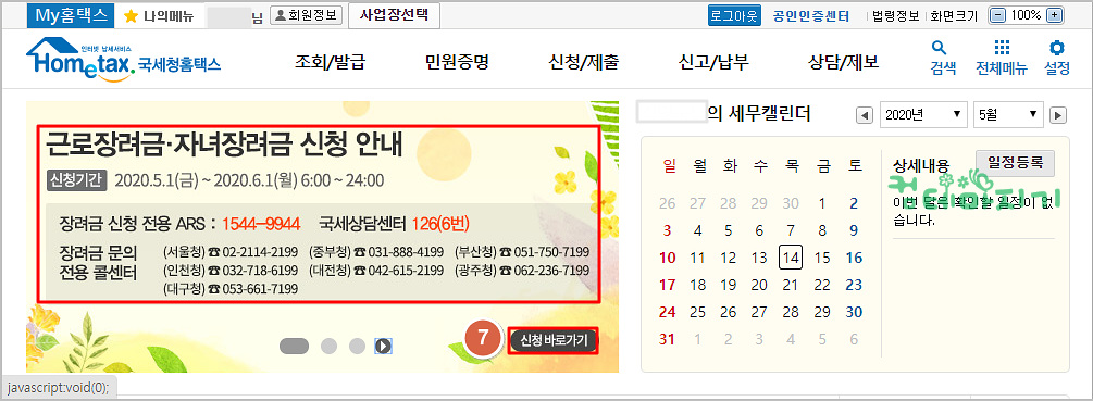 ▼ 이제, 로그인 상태에서 홈화면의 근로장려금. 자녀장려금 신청 안내 하단의 7. 신청바로가기를 클릭합니다.