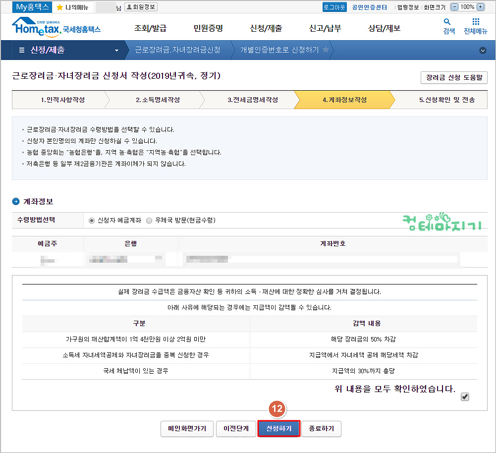계좌정보를 입력한 다음, 12. 신청하기를 클릭합니다.