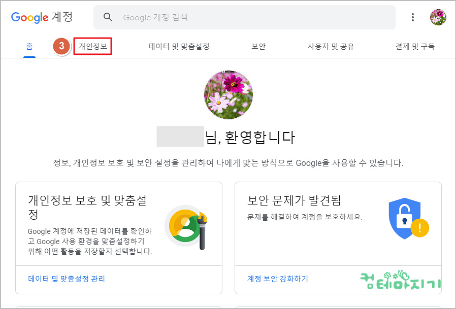 ▼ 구글계정 화면에서 3. 개인정보 탭을 클릭합니다.