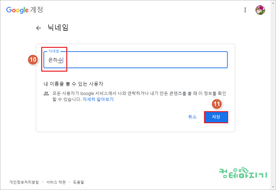 ▼ 닉네임 입력화면에서 10. 닉네임을 입력한 다음, 11. 저장을 클릭합니다. 이 시간에는 구글계정 이름변경 닉네임 지정하는 방법에 대해서 알아보았습니다.