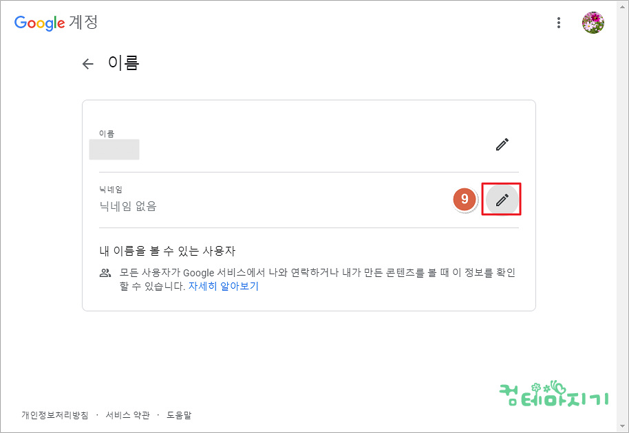▼ 이름 화면에서 닉네임 항목 오른쪽 9. 연필 아이콘을 클릭합니다.