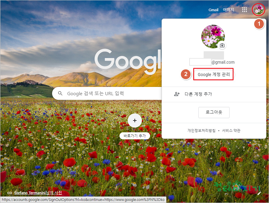 로그인 후, 1. 로그인 아이콘을 클릭하여, 2. Google 계정 관리를 클릭합니다.