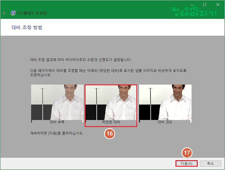 ▼ 대비 조정화면은 위에서 설명했기 때문에 18. 다음(N)을 클릭합니다.