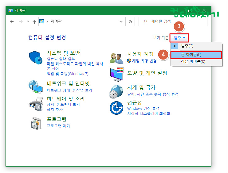 ▼ 우측상단 보기기준에서 3. 범주클릭, 4. 큰 아이콘(L)을 클릭합니다.