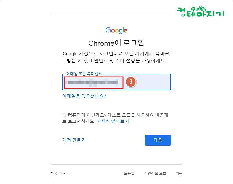 ▼ 크롬에 로그인 화면에서 3. 이메일 또는 휴대전화 번호를 입력하고, [다음]을 클릭합니다.
