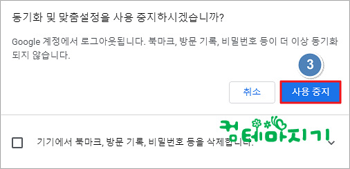 ▼ 동기화 및 맞춤설정을 사용 중지하시겠습니까? 묻는 화면에서 3. 사용 중지를 클릭하여 동기화를 중지 시킵니다. 이 시간에는 구글크롬 동기화 사용 또는 중지시키는 방법에 대해서 알아 보았습니다.
