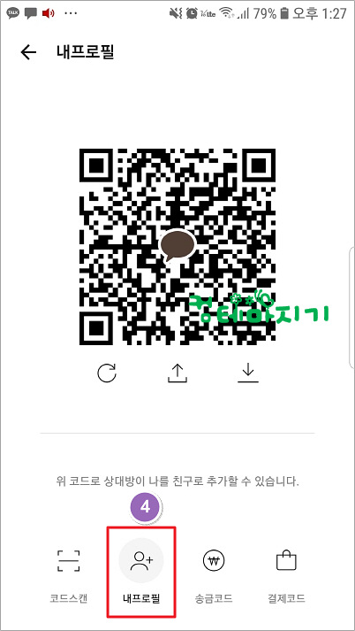 ▼ 내프로필 화면에서 4. 내 프로필 아이콘을 클릭하여 내 QR코드를 생성합니다. 매우 간단하지만, 이제 QR코드가 많이 활용되고 있는 추세이기 때문에 내 폰에 카톡QR코드 만들기를 활용해야 하겠습니다.