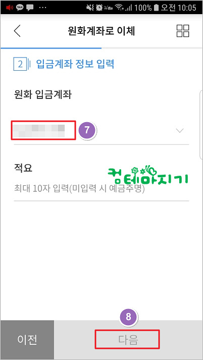 ▼ 원화계좌로 이체 화면에서 7. 원화 입금계좌를 선택하고, 8. 다음을 터치합니다.