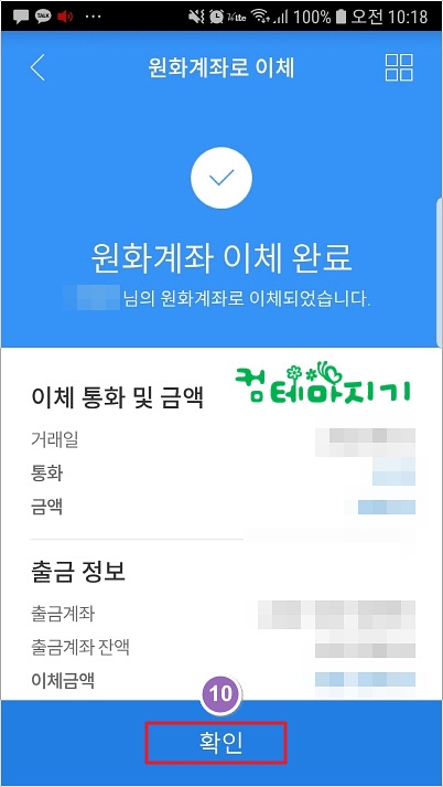 ▼ 원화계좌 이체완료 메시지를 확인하고, 10. 확인을 터치하여 이체를 마무리 합니다. 이 시간에는 스마트폰에서 우리은행계좌의 외화달러를 한화계좌로 인출하는 방법에 대해서 알아 보았습니다.