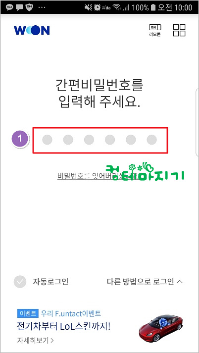 ▼ 스마트폰에서 우리은행 어플인 우리 WON 뱅킹을 오픈하여, 1. 인증단계(간편비밀번호, 공인인증서)를 거쳐 계정에 들어갑니다.