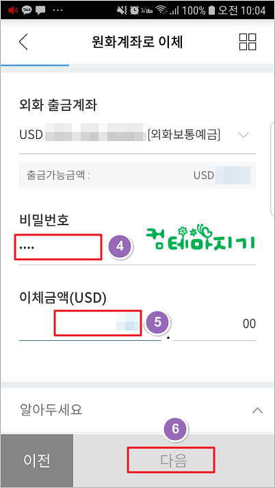 ▼ 원화계좌로 이체 화면에서 외화 출금계좌에 대한, 4. 비밀번호, 5. 이체금액을 입력합니다.