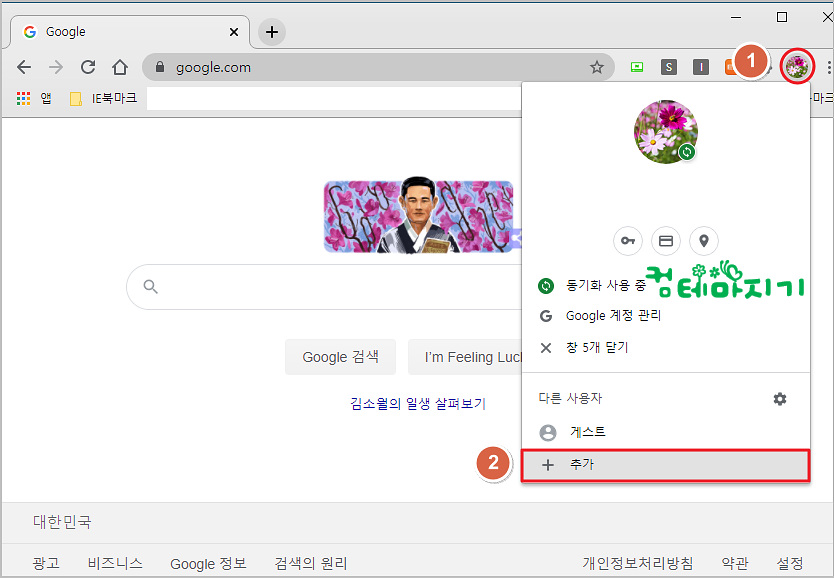 ▼ 복수의 구글계정으로 구글크롬을 사용하기 위해서 먼저, 1. 구글크롬 아이콘을 클릭한 다음, 메뉴 중에서 2. +추가를 클릭합니다.