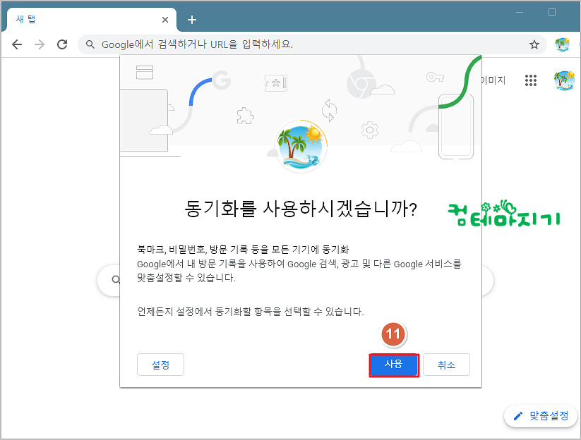 ▼ 동기화를 사용하시겠습니까? 화면에서 (회사 또는 공공장소의 기기에서는 개인정보에 접근하지 못하도록 동기화를 사용하면 안됩니다. 이때는 취소를 선택해야겠죠. 주의해야 합니다.) 11. 사용을 클릭합니다.