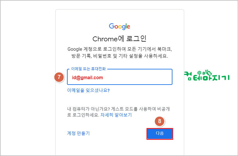 ▼ 크롬에 로그인 화면에서 7. 이메일 id나 휴대전화번호를 입력한 다음, 8. 다음을 클릭합니다.