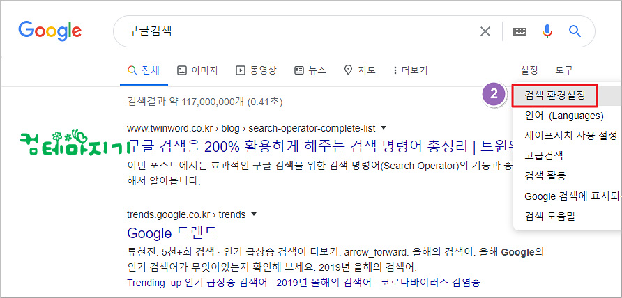 ▼ 설정 메뉴 중 2. 검색 환경설정을 클릭합니다.