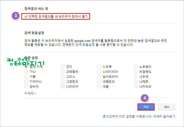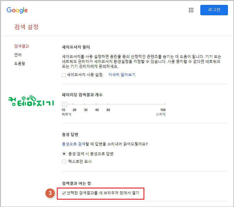 ▼ 검색 설정 화면에서 3. 검색결과 여는 창의 선택한 검색결과를 새 브라우저 창에서 열기를 체크해 주면, 검색 리스트의 사이트를 클릭할 때, 새로운 탭에서 열립니다.