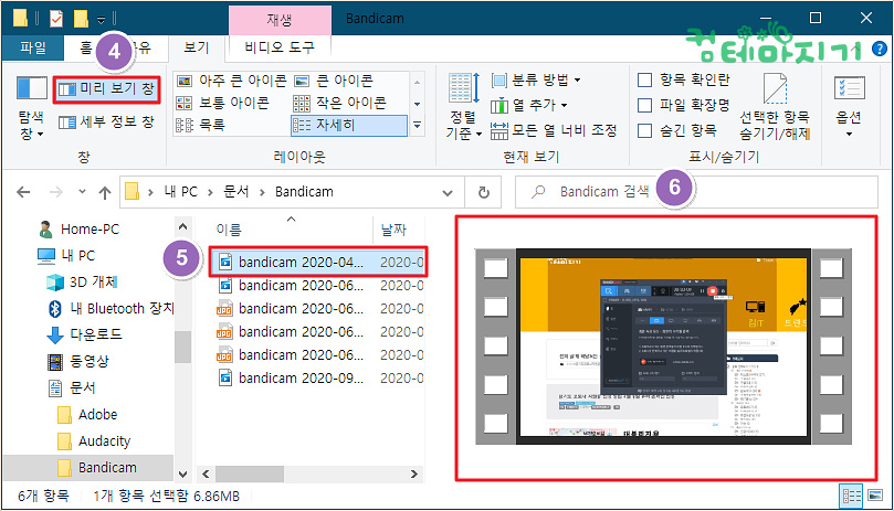 미리보기 창으로 변환하기 위해서 토글기능인 4. 미리 보기 창을 클릭하고, 5. 파일이름을 클릭하면, 6. 미리보기로 내용을 확인합니다. 간단하지만, 매우 유용합니다. 토글기능이기 때문에 다시 원위치 하려면 4. 미리 보기 창을 다시한번 클릭하면 됩니다. 이 시간에는 윈도우10 탐색기 미리보기로 편리하게 내용 확인하는 방법에 대해서 알아보았습니다.