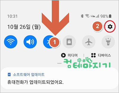 ▼ 화면 상단 1. 터치드래그하여, 2. 설정을 터치합니다.