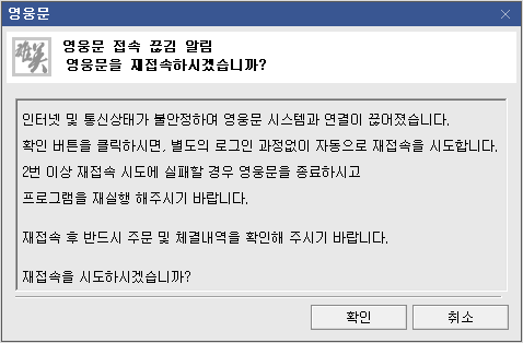 영웅문HTS를 사용하다가 일정시간 사용을 안하면 아래와 같은 메시가 나타나고 확인을 누르면, 영웅문을 다시 시작합니다. 중요한 시간에 이런현상을 접하면, 매우 난감해지고, 더 큰 문제가 발생하기도 합니다.