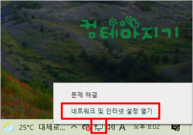 ▼ 오른쪽 하단의 네트워크 아이콘위에 마우스 왼쪽키를 눌러, [ 네트워크 및 인터넷 설정 열기 ]를 선택합니다.