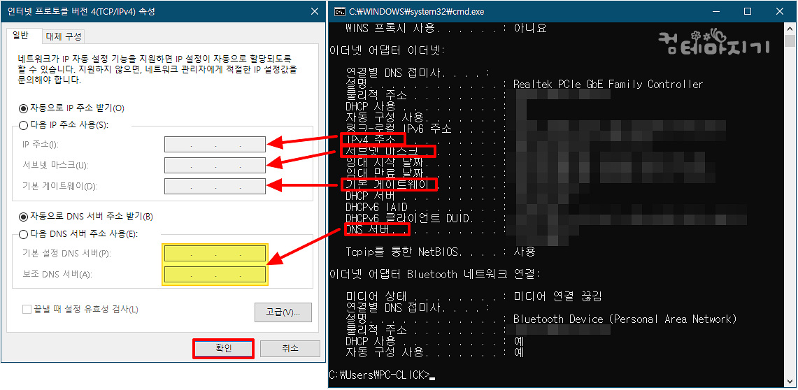 ▼ 인터넷 프로토콜 버전 4(TCP/IPv4) 속성 화면에서 [ 다음 IP 주소 사용(S) ]를 체크하여 아래와 같이, [ IP 주소(I) ], [ 서브넷 마스크(U) ], [ 기본 게이트웨이(D) ]를 화살표와 같이, 오른쪽 인터넷 정보창의 내용에서 네개의 숫자를 마우스로 클릭하여 입력해 줍니다. (처음 해 보시는 분들은 생소할 수 있습니다. 네개의 숫자를 숫자만 입력해 줍니다.)