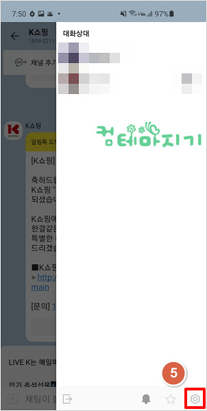 ▼ 단톡방에서 [1. 세줄아이콘]으로 들어가서 [5. 톱니아이콘]을 터치합니다.