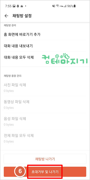 ▼ 채팅방 설정 화면에서 [6. 초대거부 및 나가기]를 터치합니다.
