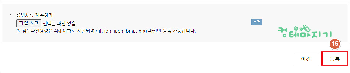마지막으로 한가지, 증빙 서류는 스캔하여 파일로 첨부 [추가]를 클릭한 다음, [15. 등록]으로 업로드합니다.