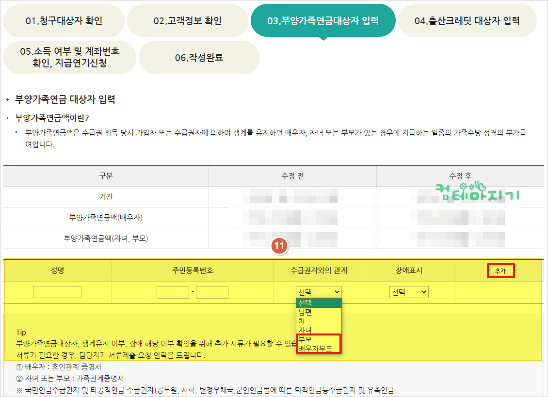 ▼ 부양가족 연금 대상자 입력 화면에서 [11. 배우자/자녀, 부모] 내용을 확인한 후, 부양가족이 더 있다면, 성명, 주민등록번호 등 내용을 입력, 선택하고 [추가]를 클릭합니다.