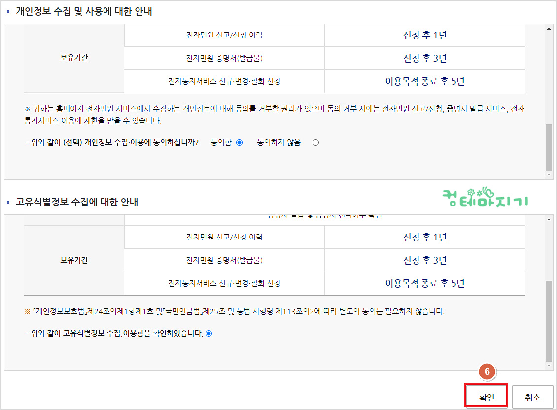 ▼ 개인정보 수집 및 사용에 대한 안내의 개인정보 수집.이용에 동의 를 [체크]하고, 고유식별정보 수집, 이용함 확인을 [체크]한 다음, [6. 확인]을 클릭합니다.