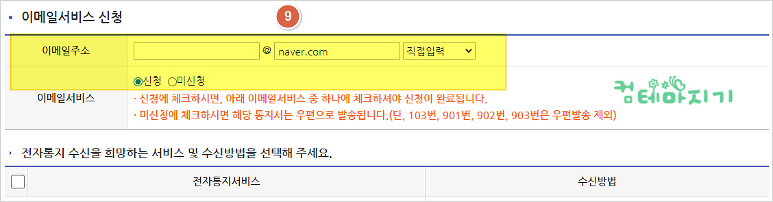 ▼ 이메일서비스 신청 화면에서 알림을 이메일로 받기 위해서 [9. 이메일주소]를 입력하고, 아래, [신청]을 체크 합니다.