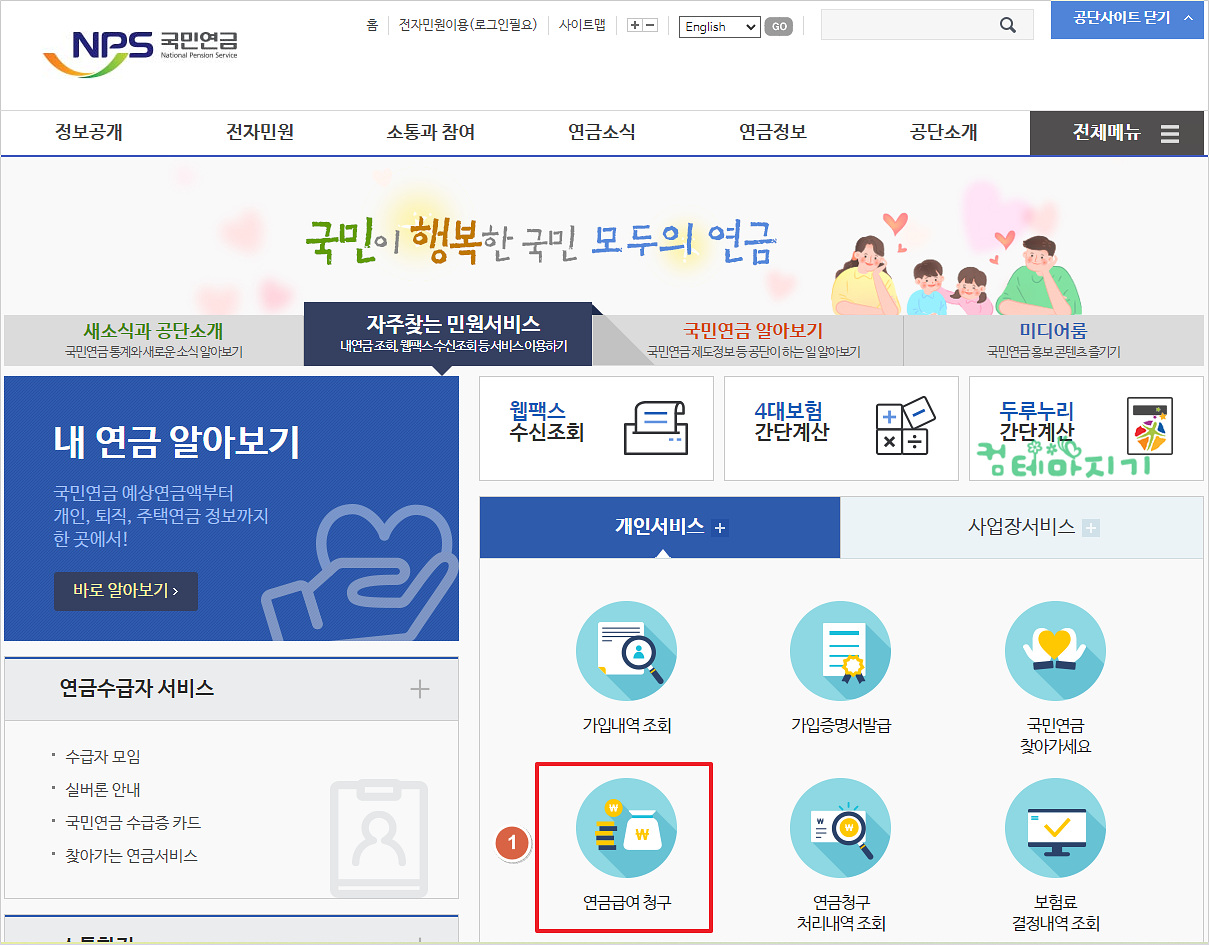 ▼ 국민연금 홈페이지 중간에 [자주찾는 민원서비스]를 클릭한 다음, [1. 연금급여청구]를 클릭합니다.