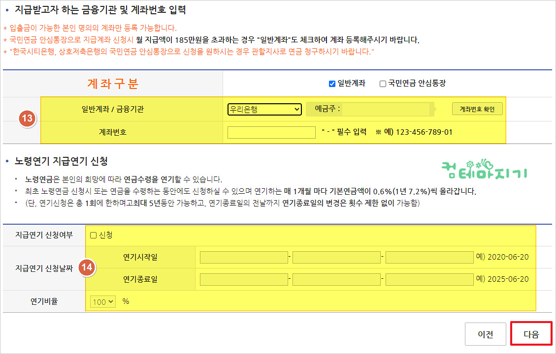 만일, 노령연기, 지급연기 신청을 원한다면, [14. 지급연기 신청여부/신청날짜]를 입력한 후, [다음]을 클릭합니다.