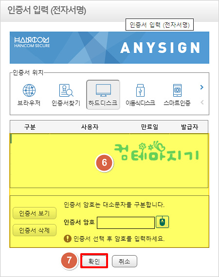 ▼ 인증서 입력 화면에서 [6. 인증서 선택 / 인증서 암호 입력]한 다음, [7. 확인]을 클릭합니다.
